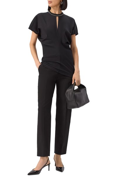 Лаконичный топ из эластичного шелкового атласа впишется как в офисный, так и в вечерний образ. Единственный декор – цепочка мониль сзади на горловине. Модель застегивается потайной пуговицей над каплевидным вырезом.