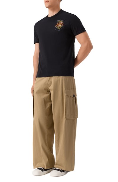 Футболку прямого кроя сшили из хлопкового джерси. Изделие украсили спереди принтом с изображением коктейля Негрони, а сзади разместили его более крупную версию с рецептом напитка. Принадлежность бренду обозначили логотипом на левом рукаве.