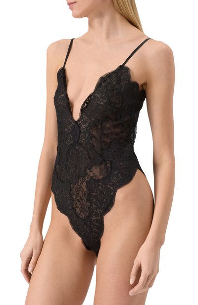Боди оттенка Sicilia выполнили из шелкового атласа стрейч, а для отделки использовали кружево с цветочным узором. Модель с чашечками-балконет, регулируемыми бретелями и фестончатыми краями застегивается потайной молнией сзади.