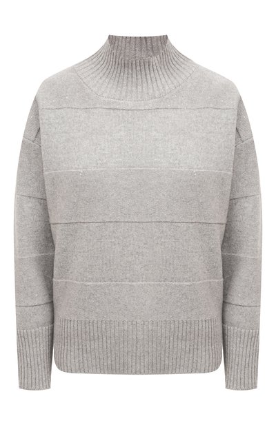 Меланжевый пуловер с рельефным полосатым узором выполнен из пряжи на базе шерсти, шелка и кашемира. Модель с высоким воротником, поясом и манжетами в рубчик украшена миниатюрными пайетками.