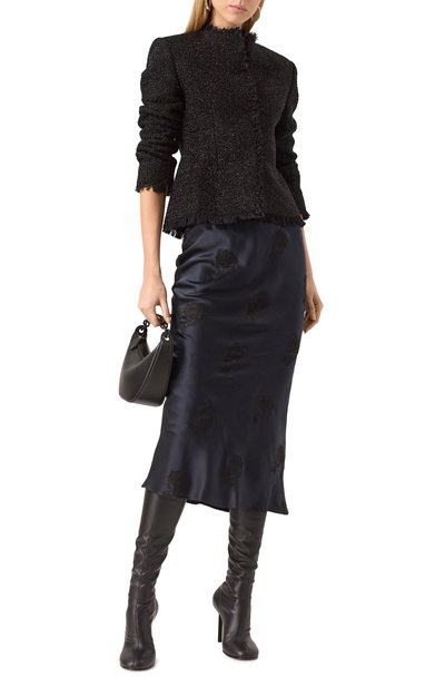 Вечернюю юбку сшили из микса вискозы и шелка с бархатным узором, созданным в технике деворе. Полупрозрачную модель дополнили коротким плотным подкладом. Изделие с высоким разрезом сзади застегивается потайной боковой молнией.