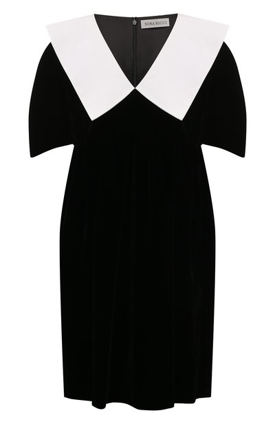 Мини-платье babydoll с завышенной линией талии сшили из мягкого бархата. Модель с V-образным вырезом и широким контрастным воротником застегивается сзади потайной молнией.