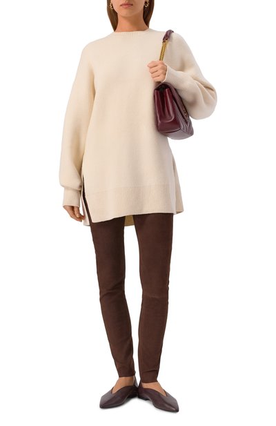 Легинсы из эластичной замши гармонично сочетаются с удлиненным свитером. Сбоку модель со средней посадкой дополнили потайной молнией.