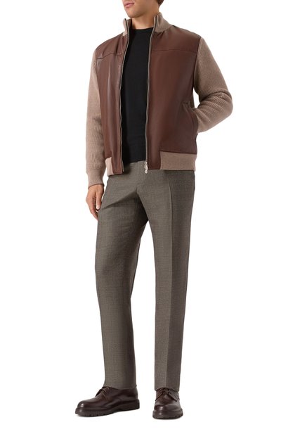 Кардиган, утепленный пушистой подкладкой, изготовили из меланжевого кашемира. Воротник-стойку, эластичные манжеты и пояс выполнили из трикотажа в рубчик. Модель с двумя боковыми карманами застегивается встречной молнией с брендированными пуллерами.