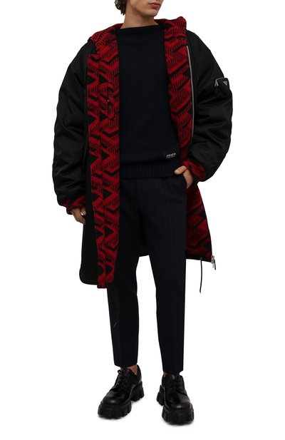 Свитер из чистого кашемира связали гладью, а чуть отличающиеся по оттенку широкий пояс, манжеты и высокий ворот выполнили резинкой. Модель застегивается молнией с брендированным пуллером фирменного алого оттенка.