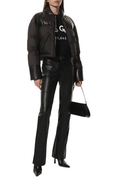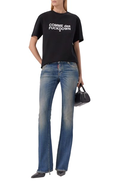Для пошива футболки с круглой горловиной использовали хлопковое джерси. Спереди изделие украсили эмблемой и логотипом марки в стиле граффити, с которыми рифмуется крупный принт сзади.