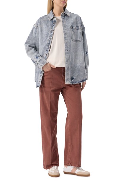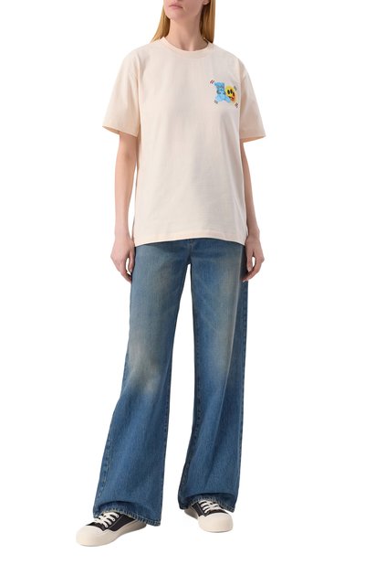 Футболку из хлопкового джерси украсили разноцветными логотипами, дополнив более крупную надпись сзади ироничным рисунком. М одель подружится и с джинсами, и со спортивным костюмом.