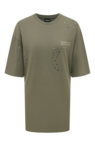 Хлопковую футболку силуэта oversize декорировали множеством мелких отверстий. Модель украсили на левом рукаве брендированной нашивкой, спереди и сзади – искаженными логотипами.