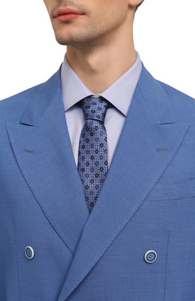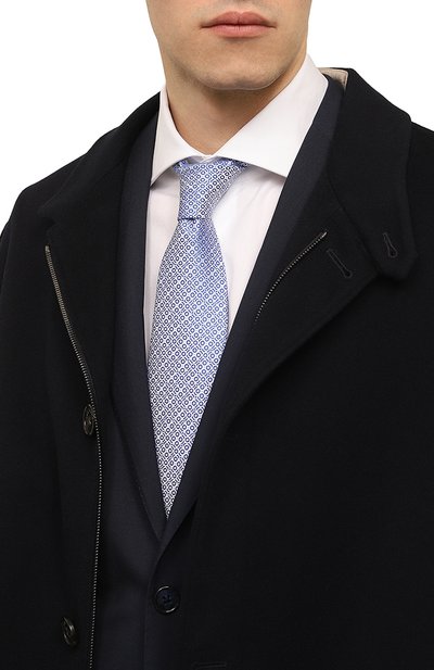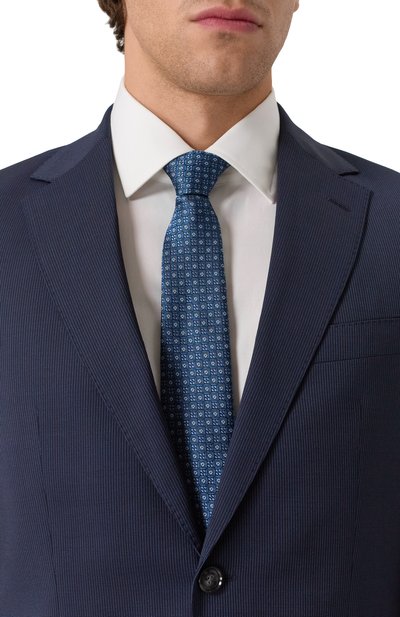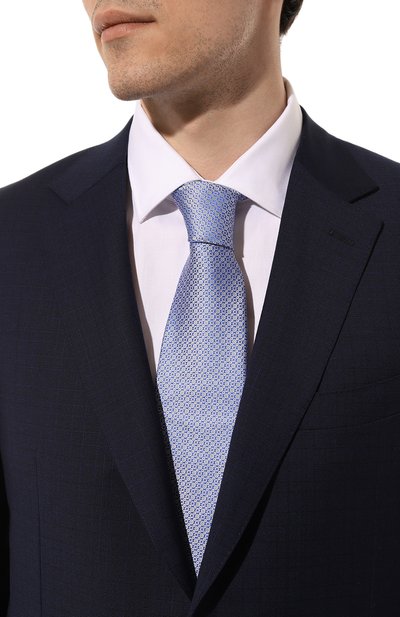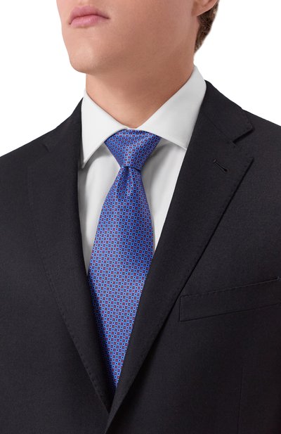 Галстук с графичным цветочным микроузором будет одинаково хорошо смотреться и с темным, и со светлым костюмом. Широкий аксессуар сшили из рельефного шелкового жаккарда.