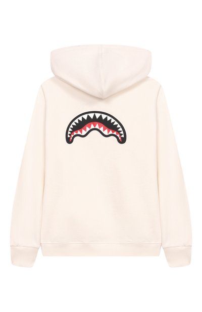 Худи словно сшили из трех разных изделий. Рукава и боковые вставки связаны из полушерстяной пряжи. Передняя и задняя полочки выполнены из хлопкового трикотажа. Эластичная модель украшена принтом с символикой марки.