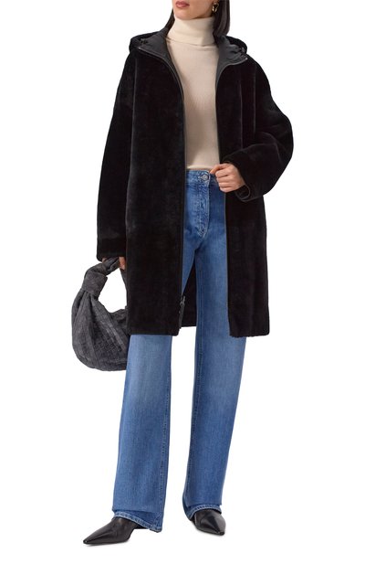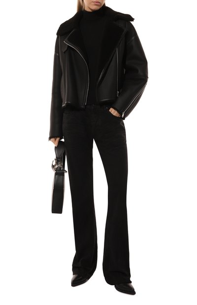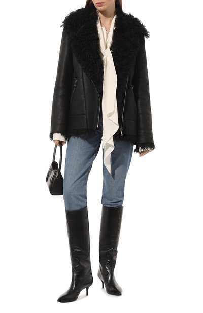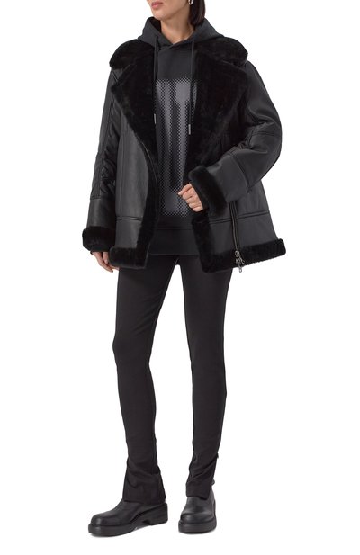 Дубленку, напоминающую косуху, сшили из овчины с глянцевой зернистой фактурой снаружи и густым мехом внутри. Два прорезных кармана, как и сама модель с широкими лацканами, застегиваются молниями.