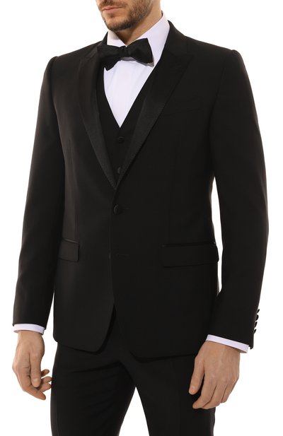 В коллекцию Essential вошел смокинг-тройка из эластичной шерсти. Пиджак силуэта Sicilia fit, с лацканами из шелкового атласа дополнили тремя внешними и тремя внутренними карманами. Еще четыре кармана есть у брюк с лампасами. Посадка жилета с V-образным вырезом регулируется хлястиком сзади.