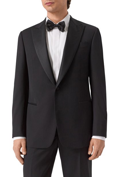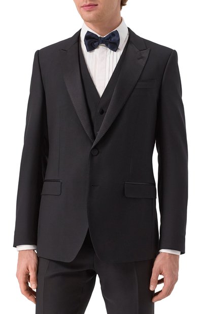 Смокинг-тройку из коллекции Essential сшили из эластичной шерсти. Приталенный пиджак силуэта Sicilia fit, с тремя внутренними и тремя внешними карманами дополнили лацканами из шелкового атласа. Из него же выполнили лампасы брюк с четырьмя карманами и отделку жилета с регулируемым хлястиком.