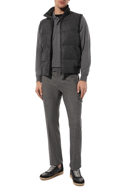 Брюки с двумя карманами карго и четырьмя прорезными изготовили из шерсти с микроузором «пье-де-пуль». Под широким поясом с эластичной вставкой закрепили спереди петлю с деталью в виде фирменного октагона.