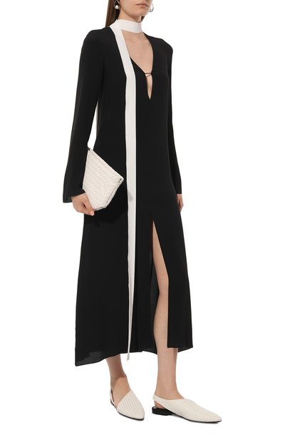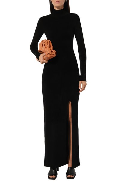 Трикотажное миди-платье с удлиненными рукавами связали из буклированной шерстяной пряжи, усиленной полиамидом. Широкую драпировку на плечах подчеркнули съемной брошью в виде морской раковины.