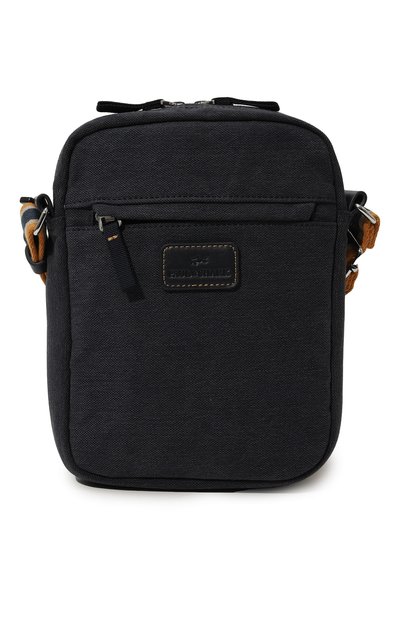 Сумку с полосатым ремнем сшили из прочного хлопкового канваса. Модель, украшенную кожаной брендированной нашивкой, дополнили карманом с молнией на передней панели, а также накладным и застегивающимся внутри.