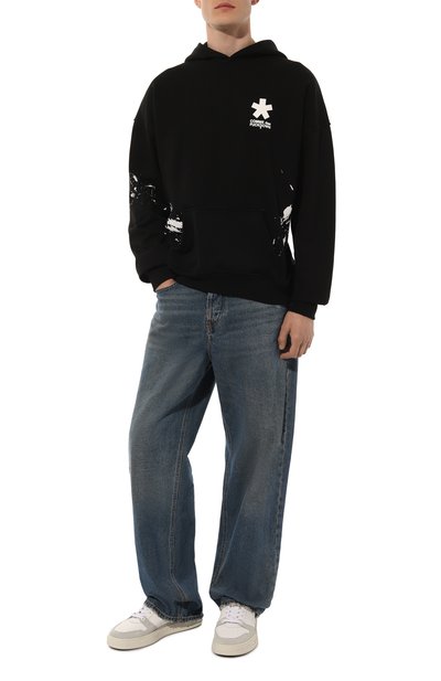 Символику бренда на этом худи дополнили слоганом Rebel heart и изображением трех доберманов. Декор поддержали логотипом над левой манжетой. Модель с эластичным поясом и карманом «кенгуру» сшили из хлопкового трикотажа.