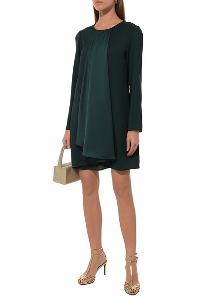 Приталенный крой миди-платья с асимметричным подолом подчеркнули ремнем с фирменной пряжкой. Модель из крепа на основе ацетата и вискозы застегивается пуговицей сзади над каплевидным вырезом.