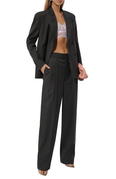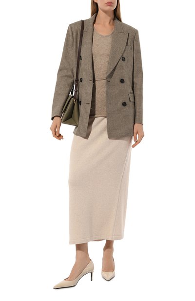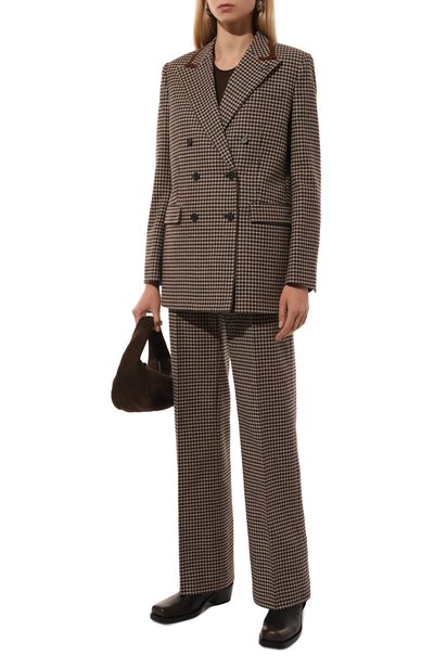 Двубортный жакет с узором пье-де-пуль выполнили из шерсти первого пострига и дополнили шелковистой подкладкой. Модель с тремя карманами и шлицей предлагаем сочетать с черной юбкой и сапогами.