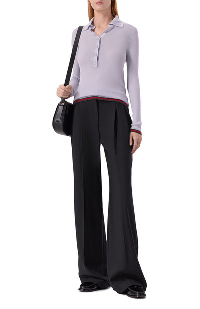 Пуловер со спущенной линией плеч выполнили английской резинкой из хлопка. Под отложным воротником сзади — тонкая кайма из цепочки мониль. Модель дополнили короткой планкой с роговыми пуговицами.