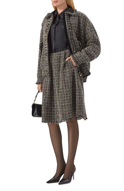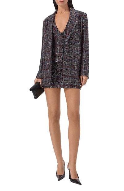 Мини-юбку выполнили из полувискозного трикотажа, зигзагообразный узор на котором подчеркнули металлизированными нитями и пайетками. Наши стилисты предлагают носить модель с парным свитером и босоножками.