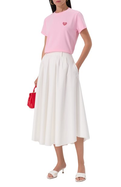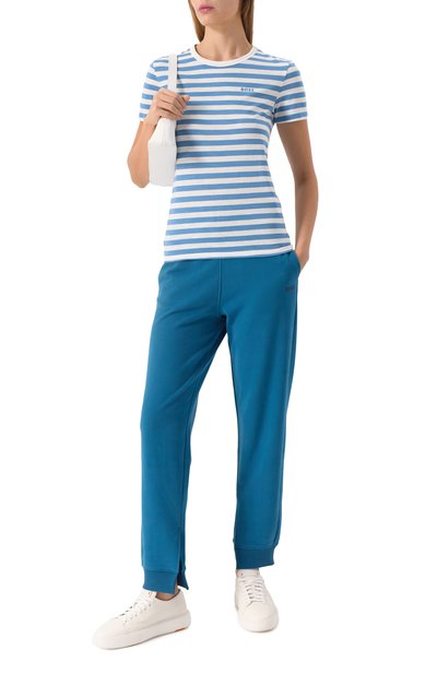 Для пошива футболки с круглым вырезом использовали гладкое джерси с органическим хлопком. Эластичная модель с небольшим логотипом марки на груди может стать основой повседневного образа с брюками и кедами.