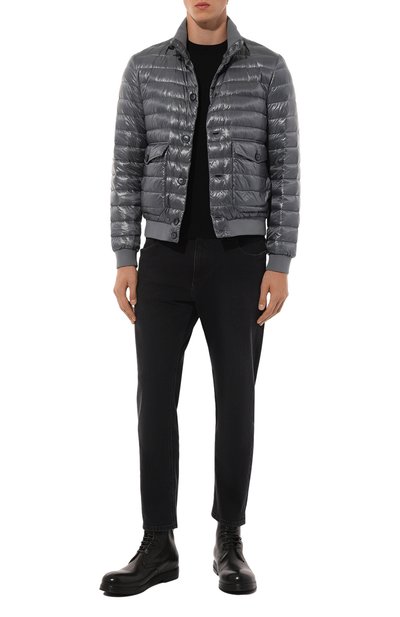 Бомбер с двумя врезными карманами сшит из кашемирового трикотажа с добавлением шелка. Воротник, манжеты и пояс украшены контрастными полосками. Куртка застегивается брендированными кнопками.