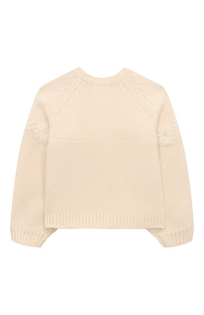 Пуловер с эластичными горловиной, манжетами и поясом связали гладью из микса шерсти и полиамида. Линию плеч и рукава украсили композициями из кристаллов, а спереди расположили фирменную литеру.