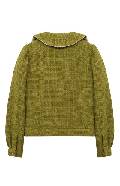 Для пошива прямого жакета с потайными кнопками использовали смесовый твид с добавлением шерсти и хлопка. Круглый вырез и накладные боковые карманы подчеркнули бахромой.