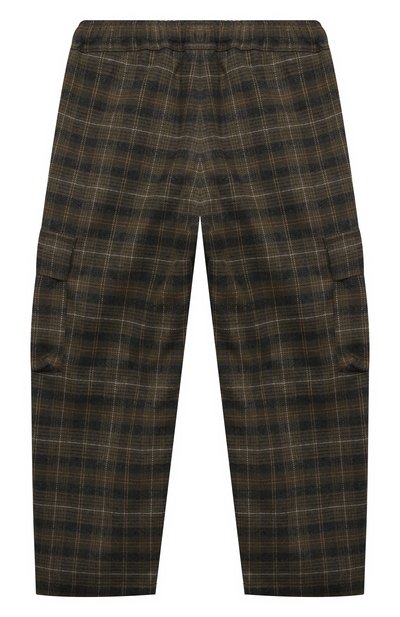 Для пошива клетчатых брюк использовали смесовую ткань с добавлением хлопка и шерсти. Модель с боковыми карманами и карго с клапанами украсили брендированной этикеткой возле эластичного пояса.