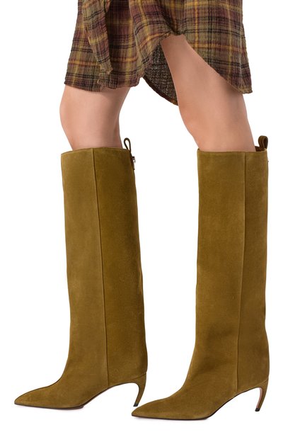 Сапоги на высоком прямом каблуке, подходящие под образы разной степени формальности, выполнили из замши. Модель с прямым голенищем не нуждается в застежках.