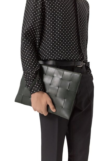 Клатч Diago сплели в технике intreccio из зернистой телячьей кожи. Внутри модели, застегивающейся молнией с пуллером-петлей, предусмотрели два плоских накладных кармана.
