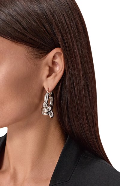 Шестигранные серьги изготовили из посеребренной латуни. Модель с логотипом, выгравированным на внутренней стороне, инкрустировали пятью прямоугольными полупрозрачными циркониями.