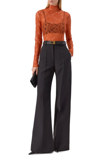 Расклешенные брюки с четырьмя карманами, стрелками и небольшими защипами сшили из слегка эластичной шерсти первого пострига. Модель в вертикальную полоску, подчеркнутую люрексом, застегивается на молнию и крючок.
