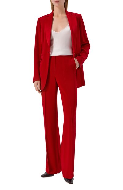 Укороченные брюки со стрелками сшили из шелкового кади-кутюра фирменного оттенка Valentino Red. Модель с подкладом из крепдешина и четырьмя карманами органично будет смотреться и с парной блузой, и с контрастными вещами.