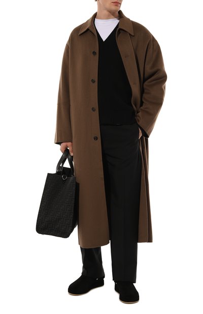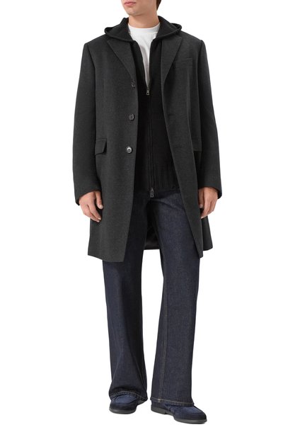Кардиган с V-образным вырезом, рельефными швами и заниженной линией плеч выполнен из тонкой пряжи на основе шерсти мериноса, руна альпака и полиамида. Модель силуэта oversize застегивается на пуговицы.