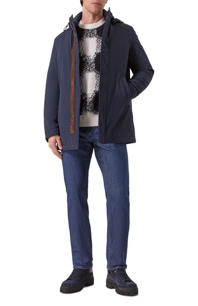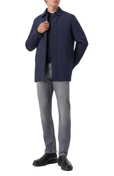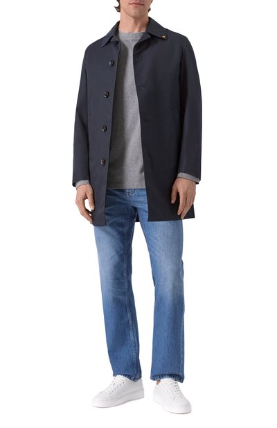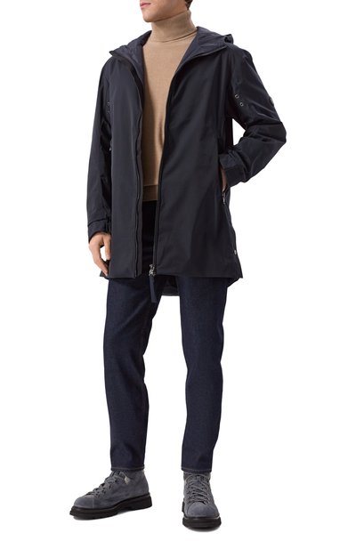 Плащ Brandon из эластичного нейлона дополнили съемной стеганой манишкой с высоким воротом. Утепленная утиным пухом модель со шлицей, тремя внешними и парой внутренних карманов застегивается роговыми пуговицами и молнией.