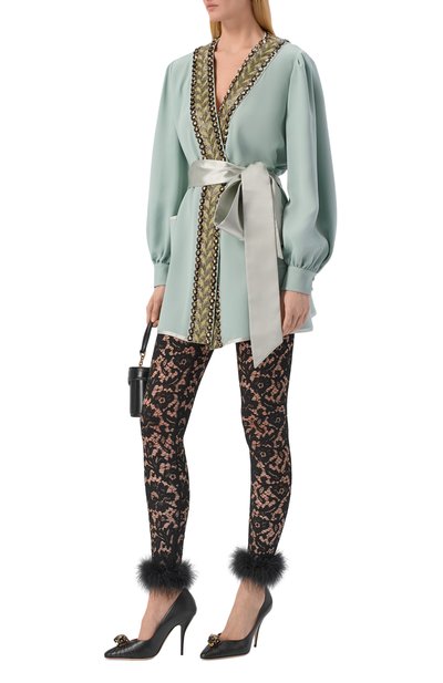 Легинсы с широким поясом и высокой посадкой выполнены из вискозного джерси с жаккардовым цветочным узором. Ширина манжет регулируется с внутренней стороны потайными молниями, а сама модель застегивается сзади акцентной золотистой.