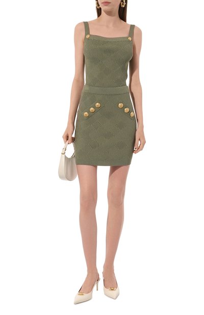 На мини-юбке из микса вискозы и полиэстера вывязали рельефный ромбовый узор. Имитацию боковых карманов подчеркнули фирменными пуговицами. Модель с эластичным поясом хорошо тянется, поэтому не нуждается в застежке.
