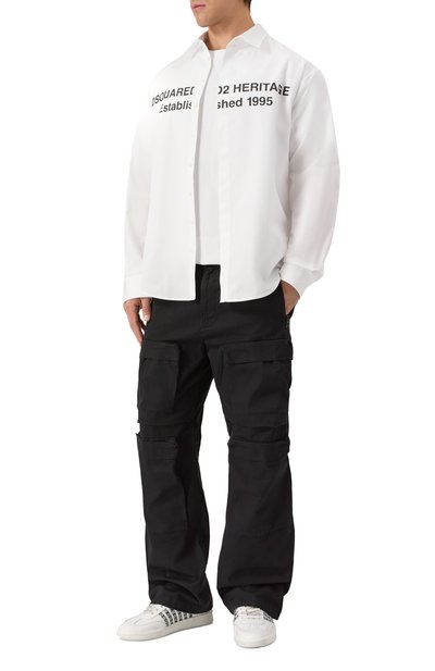 Рубашку из эластичного поплина на основе хлопка украсили принтом Kiss и логотипом с сердцем вместо точки над лите рой i. Модель с закругленным нижним краем застегивается потайными пуговицами, верхнюю из которых оставили на виду.