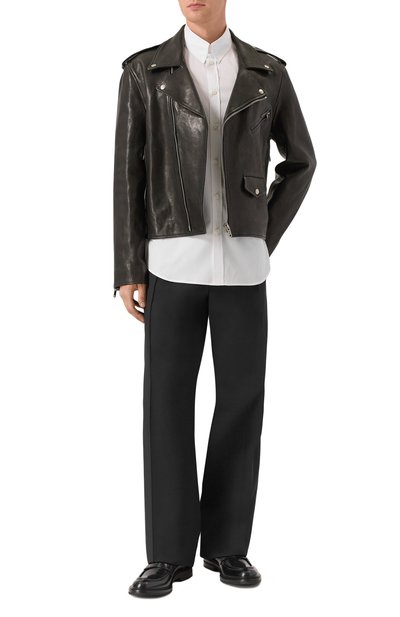 Рубашку из эластичного поплина на основе хлопка украсили принтом Kiss и логотипом с сердцем вместо точки над литерой i. Модель с закругленным нижним краем застегивается потайными пуговицами, верхнюю из которых оставили на виду.