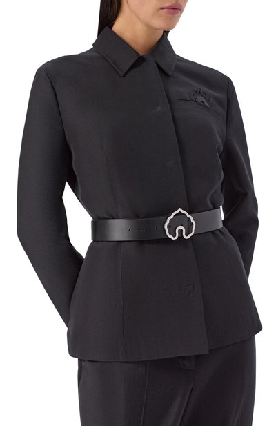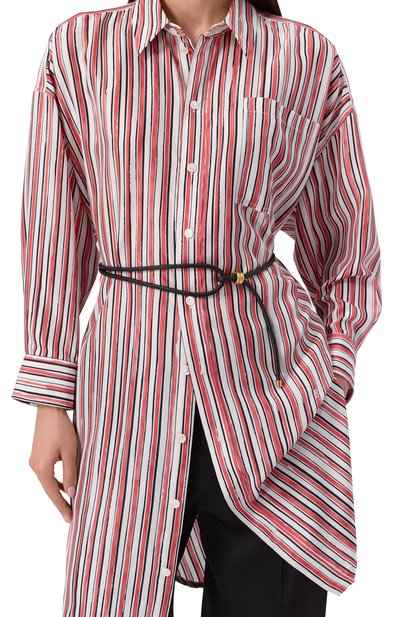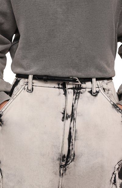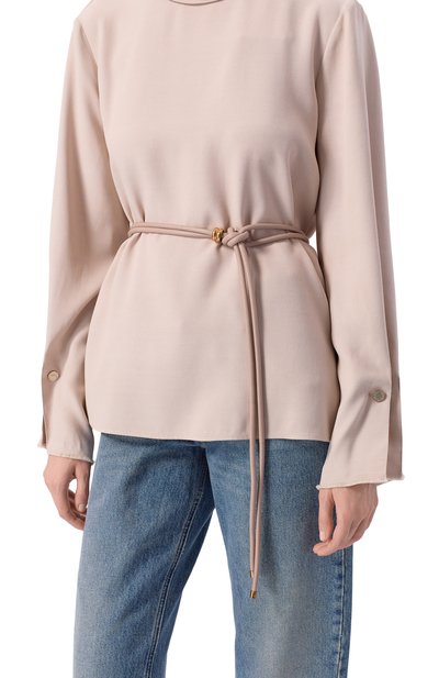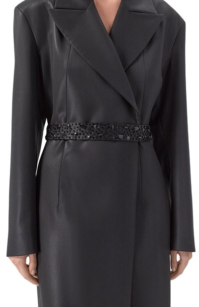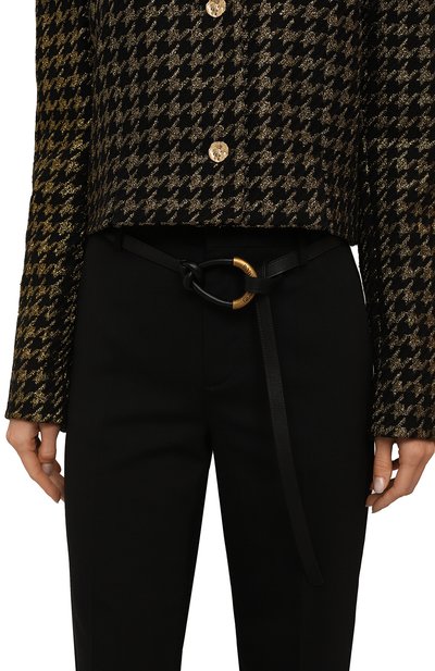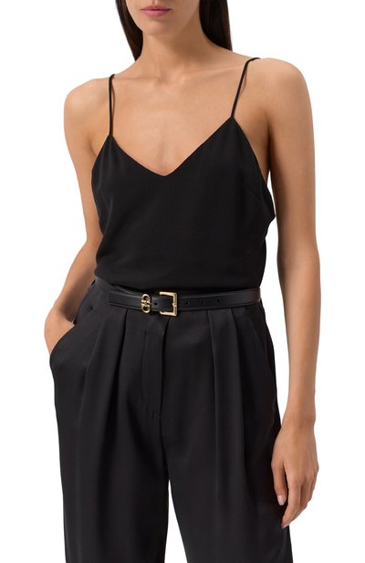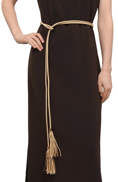 Узкий пояс-ленту выполнили из гладкой кожи. Таким же материалом обтянули круглые подвески на концах. Аксессуар найдет общий язык и с брючным костюмом, и с романтичным платьем.