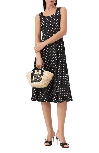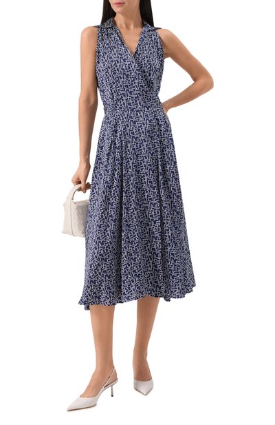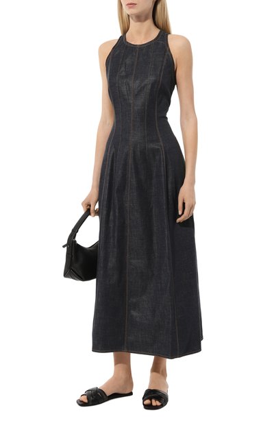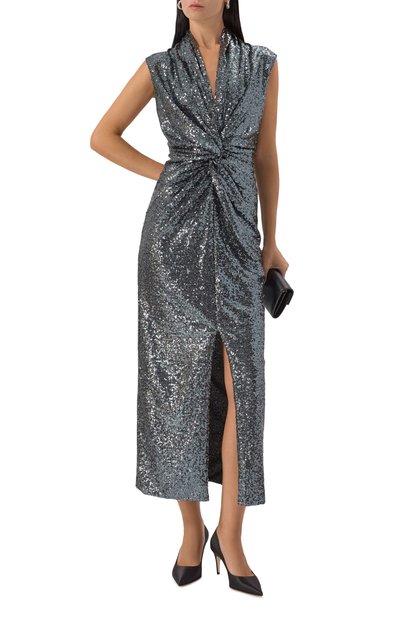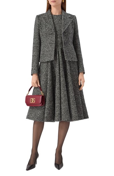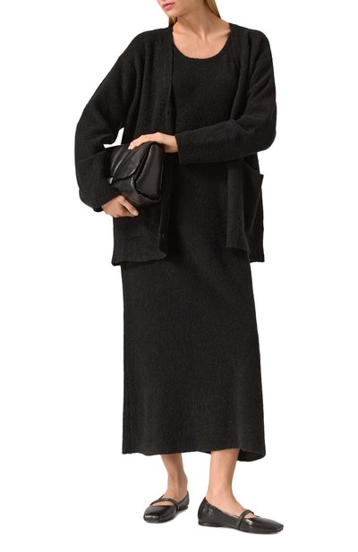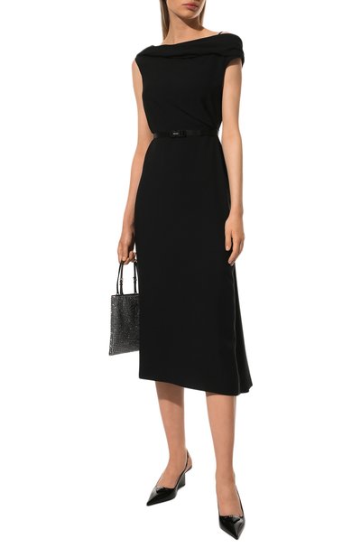 Меланжевое платье с потайной молнией сзади сшили из смесовой буклированной ткани на основе полиэстера. Миди-модель с двумя боковыми карманами дополнили тонким съемным поясом.