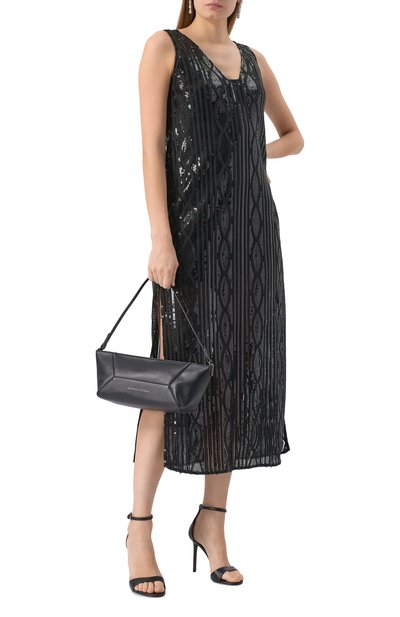 Меланжевое платье с потайной молнией сзади сшили из смесовой буклированной ткани на основе п олиэстера. Миди-модель с двумя боковыми карманами дополнили тонким съемным поясом.