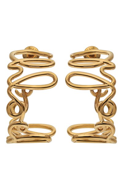 Легкие серьги из латуни с золотистым финишем смогут стать частью и повседневного, и нарядного образа. Модель дополнили застежкой-пусетом. Ажурные завитки складываются в логотип марки.