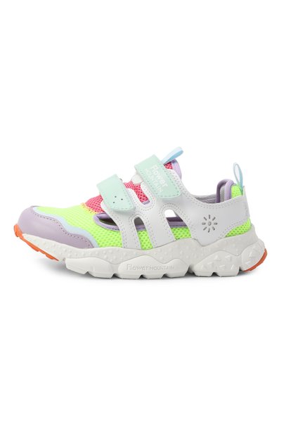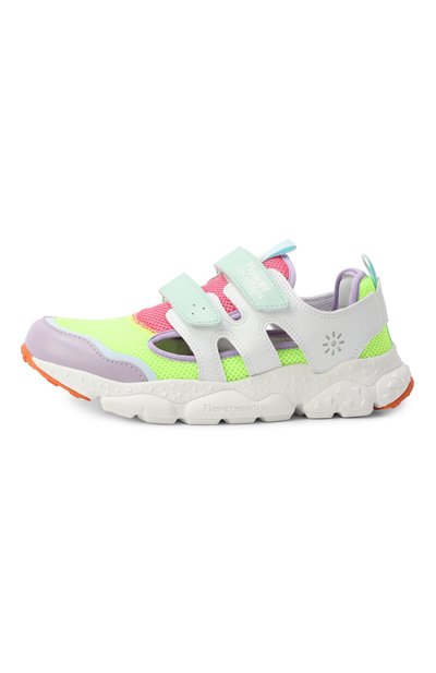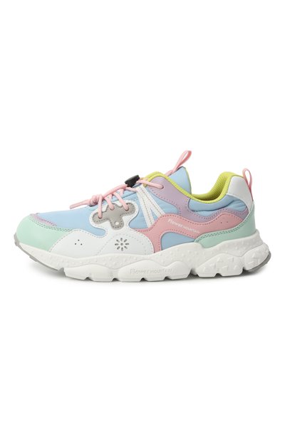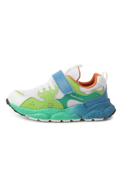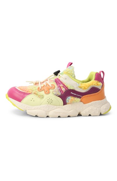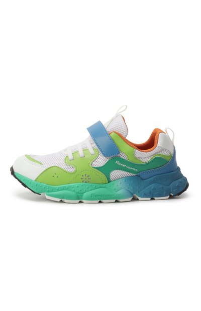 Кроссовки со знаковой перфорацией изготовили из ворсистого текстиля и полиуретана, установив пару на широкую подошву. Модель с фиксатором на шнуровке дополнили стелькой из пробкового дерева.