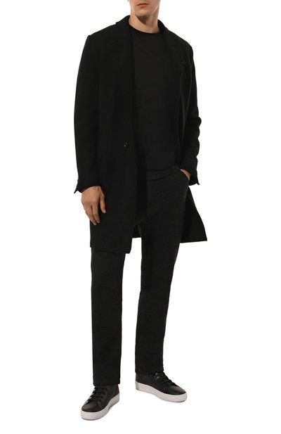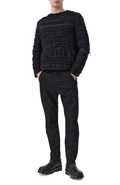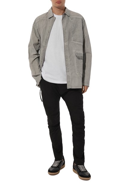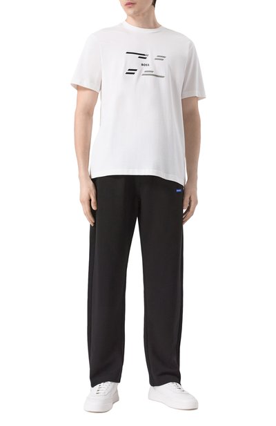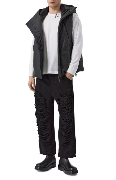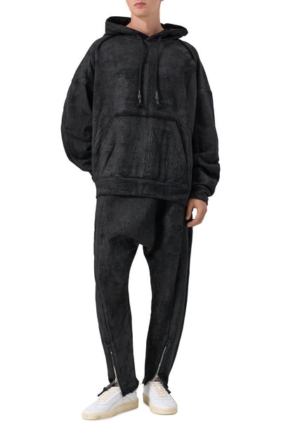 Брюки с абстрактным принтом сшили из чуть эластичного хлопкового трикотажа с добавлением полиэстера. Модель с регулируемым поясом-кулиской дополнили по бокам прорезными карманами на молнии.
