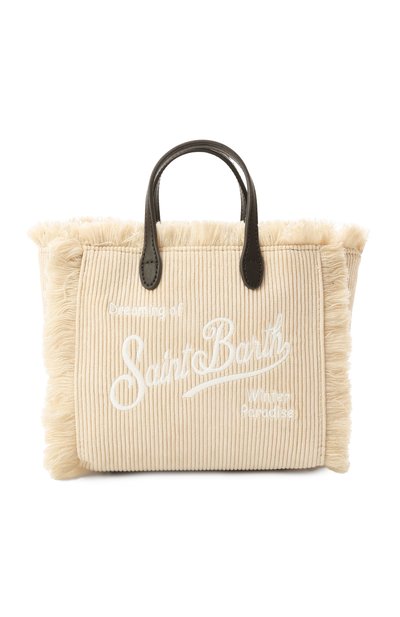 Текстильную сумку Vanity украсили бахромой по краям и брендированными надписями. Основное отделение и внутренний карман закрываются молниями. В комплекте — регулируемый плечевой ремень.