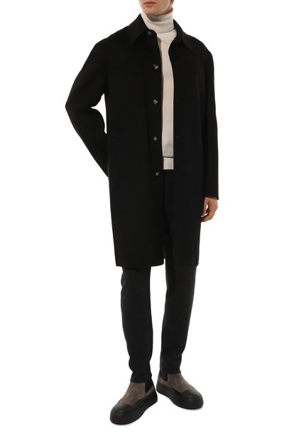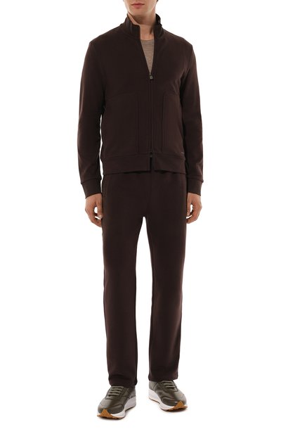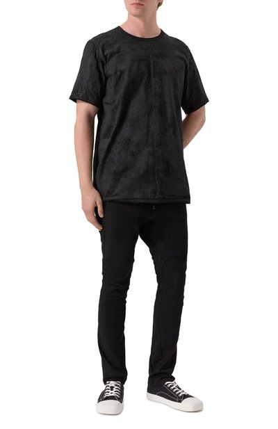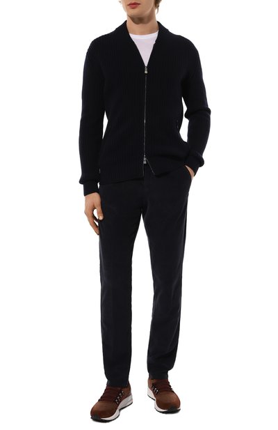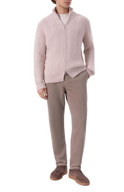 Брюки средней посадки сшили из хлопкового бархата. Модель с четырьмя врезными карманами дополнили широким поясом и узкими лампасами из атласа в тон.