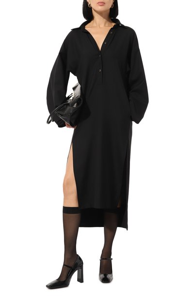 Приталенное макси-платье в рубчик связано из шерстяной пряжи, укрепленной нитями полиамида. Модель с высоким воротником застегивается длинной встречной молнией с контрастной окантовкой.